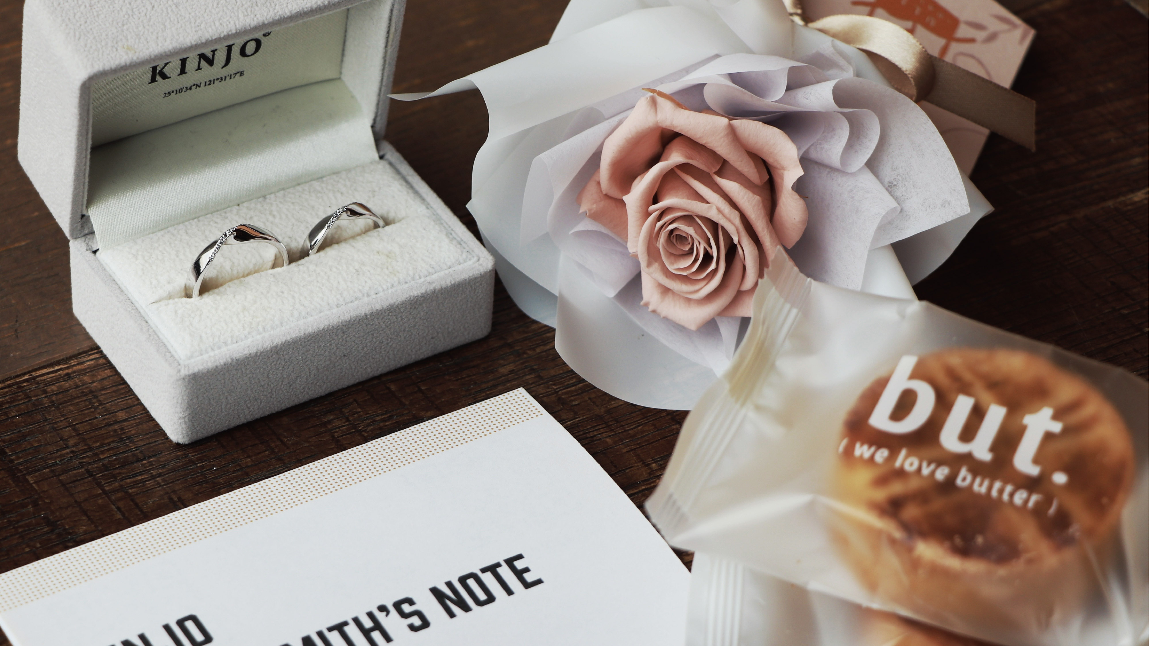 ◇ 獨家禮袋:絲絨戒盒x1、永生玫瑰花禮x1、but.奶油甜點x2